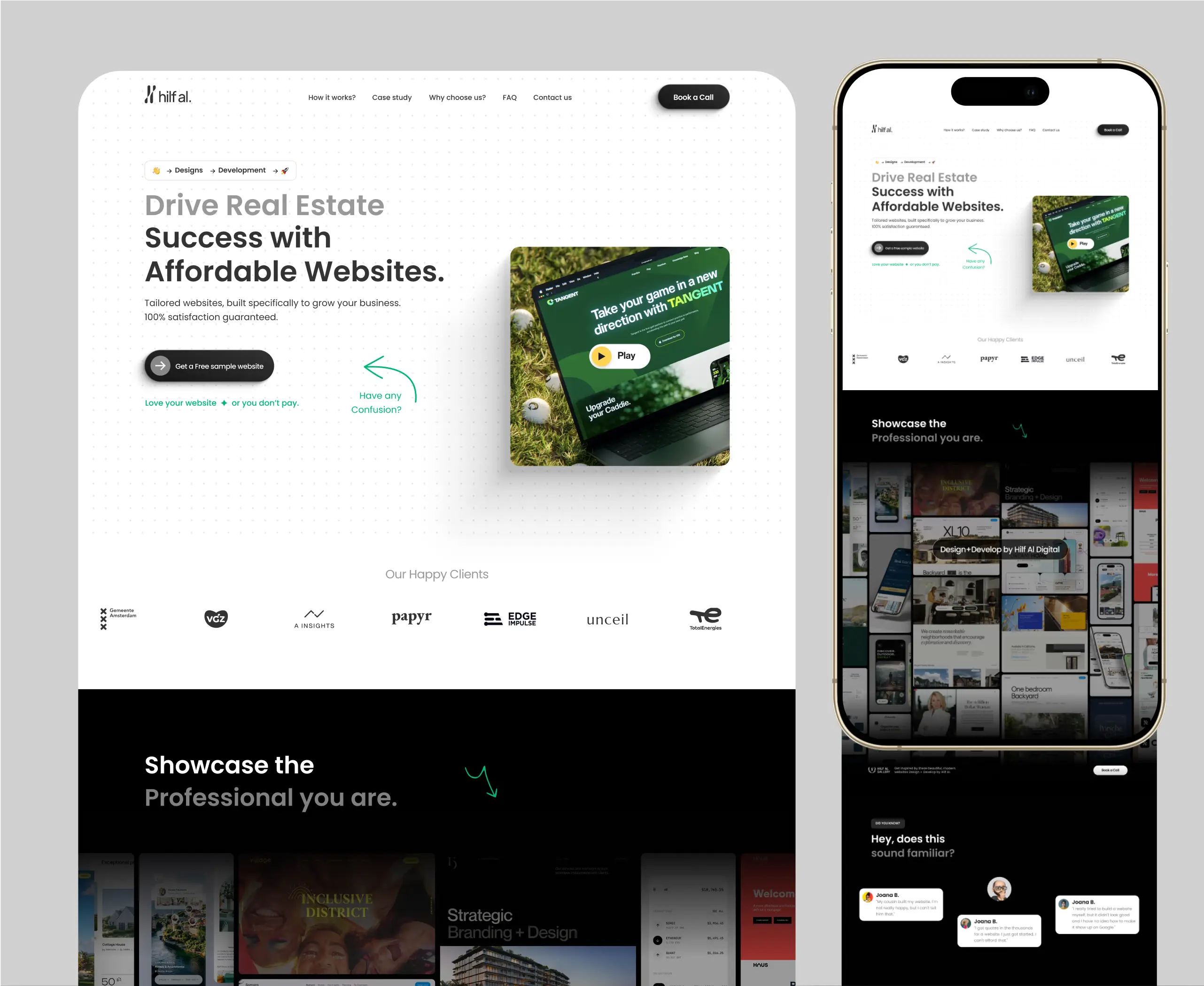 information. Key elements include a dynamic hero section, a showcase of diverse design work, and a clear presentation of services and pricing.